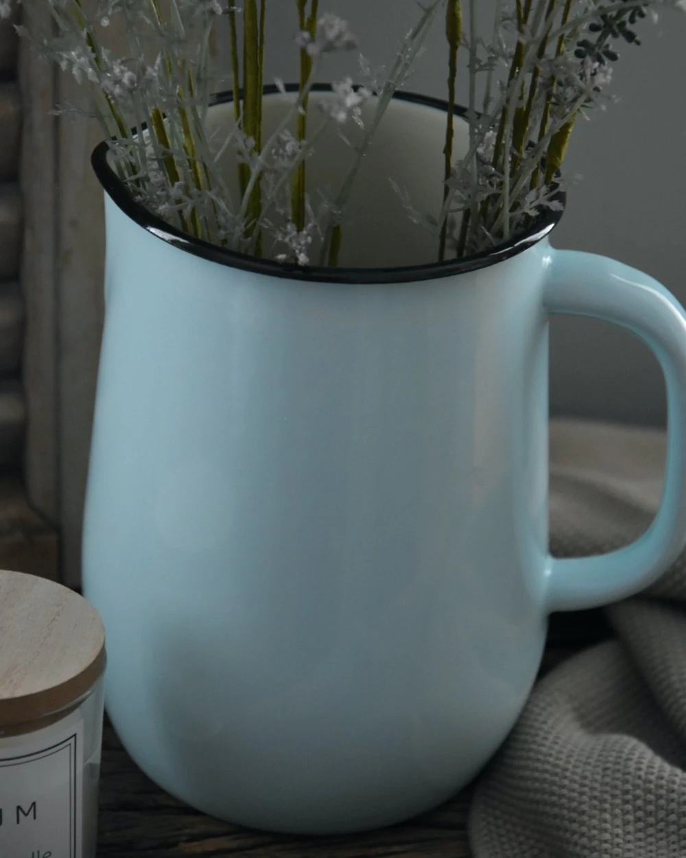 Emaille kan ‘light blue/cream’, IB Laursen per stuk. Deze leuke kan heeft een mooie licht blauwe kleur met een zwart randje en een crème binnenkant. De kan is van een mooie zware kwaliteit emaille en kan in de keuken worden gebruikt of voor bloemen….. De kan heeft een kleine tuit en een groot oor. De kan van emaille is niet geschikt voor de vaatwasser.