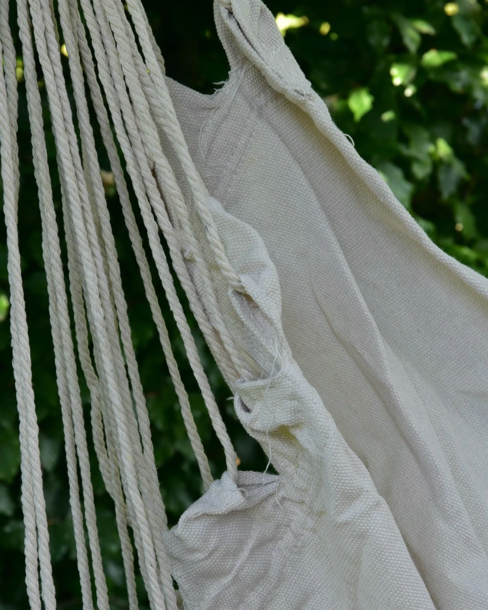 Hangstoel met kwastjes, IB Laursen. Deze leuke hangstoel van een mooie naturel stof heeft een kwastjes rand aan de onderzijde, een naturel houten stok met dik touw als hanger en een heerlijke zitting met hoge rug. De stoel kunt u een leuk plekje geven in huis, op de veranda of in de tuin bijvoorbeeld. U kunt zo in de stoel zitten of er bv een mooi matras kussen in plaatsen voor extra comfort. Een heerlijke stoel om in te wiegen, een boek te lezen en te genieten van rust….. Aan de bovenkant zit een dik touw met een lus erin zodat u hem gemakkelijk kunt ophangen.