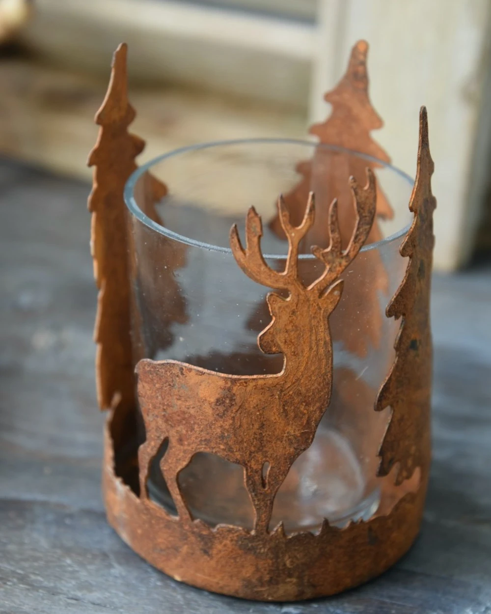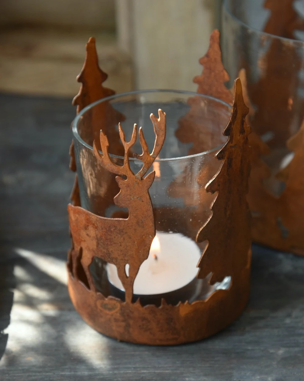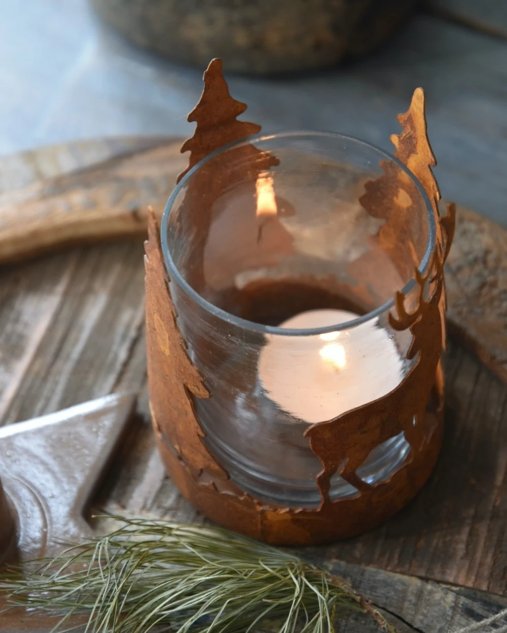 Hert en bomen theelicht roestbruin, IB Laursen. Dit leuke model theelicht geeft een sfeervolle voorstelling van een Hert tussen de bomen weer. Het frame is van metaal in roestbruin gemaakt en daarin zit een glas waar u de kaars in kunt branden. Doordat het frame in de rondte van het glas loopt ontstaat er een mooi silhouet die door het branden van een kaarsje een prachtig effect geeft op de muren. Er is ook een groter model met bomen verkrijgbaar en kan heel goed met houten materialen worden gemixt.Â