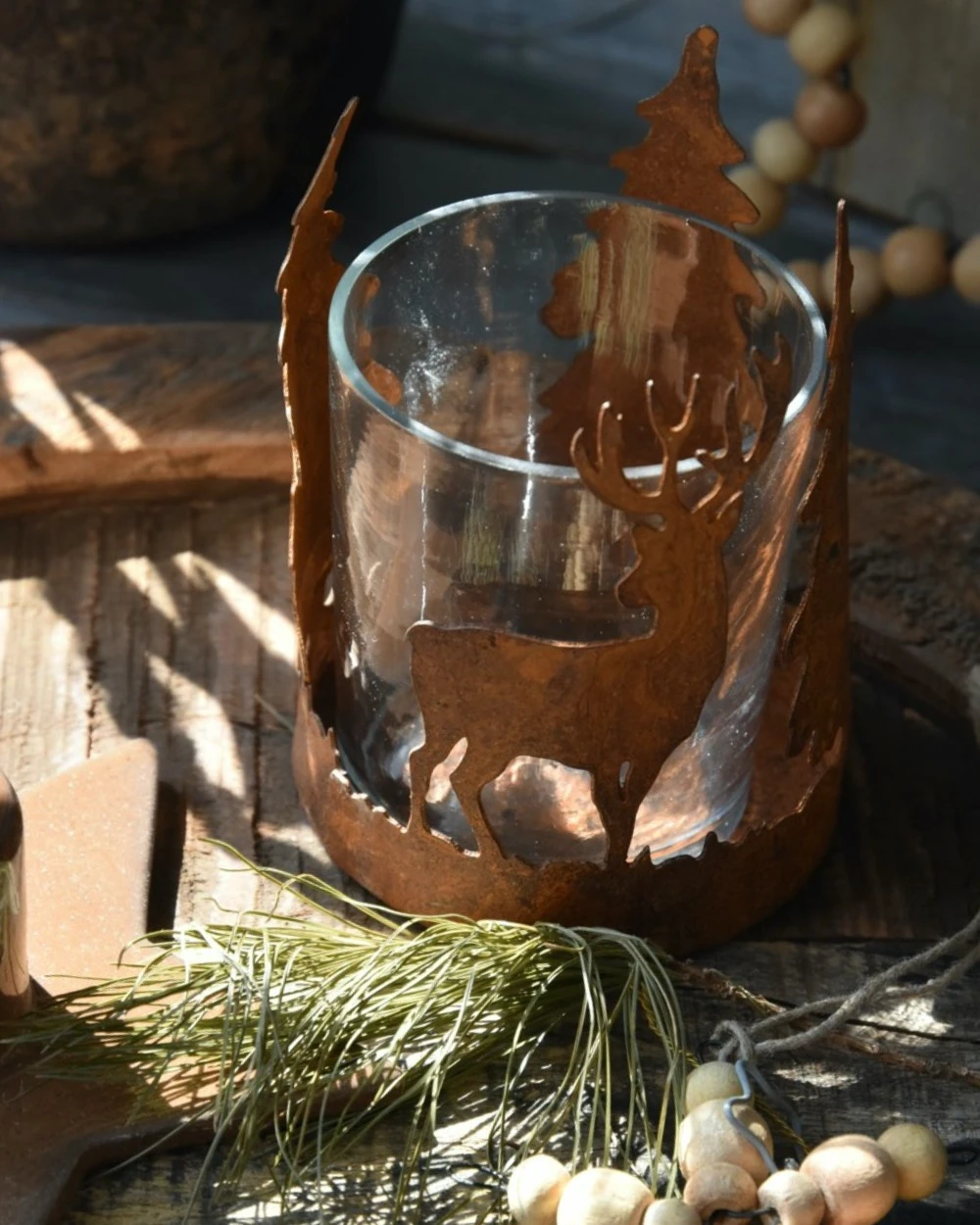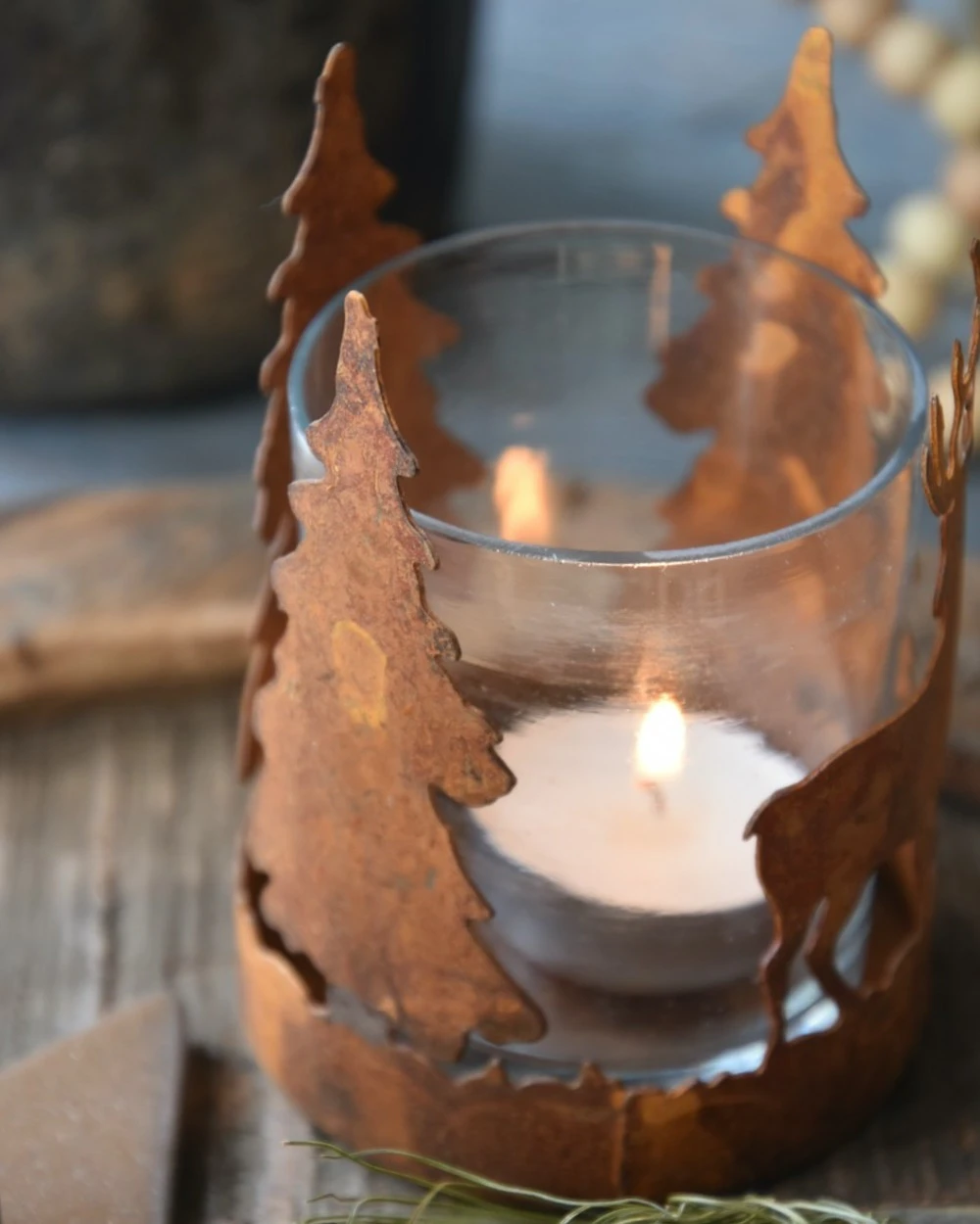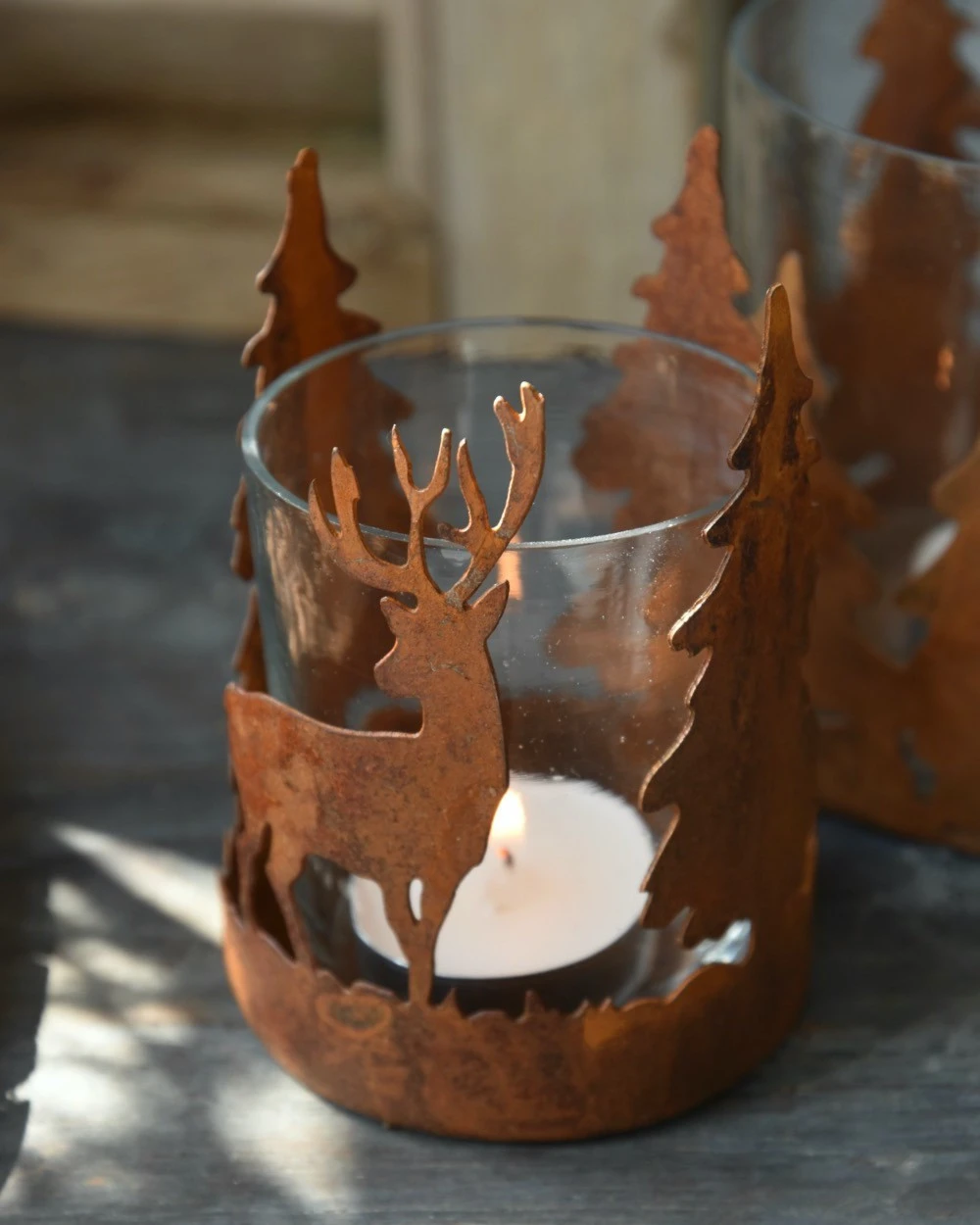 Hert en bomen theelicht roestbruin, IB Laursen. Dit leuke model theelicht geeft een sfeervolle voorstelling van een Hert tussen de bomen weer. Het frame is van metaal in roestbruin gemaakt en daarin zit een glas waar u de kaars in kunt branden. Doordat het frame in de rondte van het glas loopt ontstaat er een mooi silhouet die door het branden van een kaarsje een prachtig effect geeft op de muren. Er is ook een groter model met bomen verkrijgbaar en kan heel goed met houten materialen worden gemixt.Â