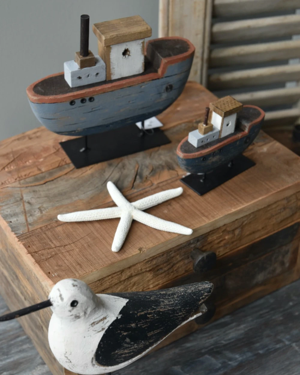 Houten schip op metalen standaard handgeschilderd blauw groot, IB Laursen. Deze leuke decoratieve boot/schip staat op een zwart metalen standaard en is met de hand van hout gemaakt en beschilderd. De boot/schip ziet er iets geleefd uit en is in mooie blauw tinten met stuurhut en al. U kunt de boot een mooie plek geven in de vitrinekast, op het dressoir of tafel.. en combineren met andere boten, schelpen en vuurtorens, om zo een mooie passende sfeer te creëren.