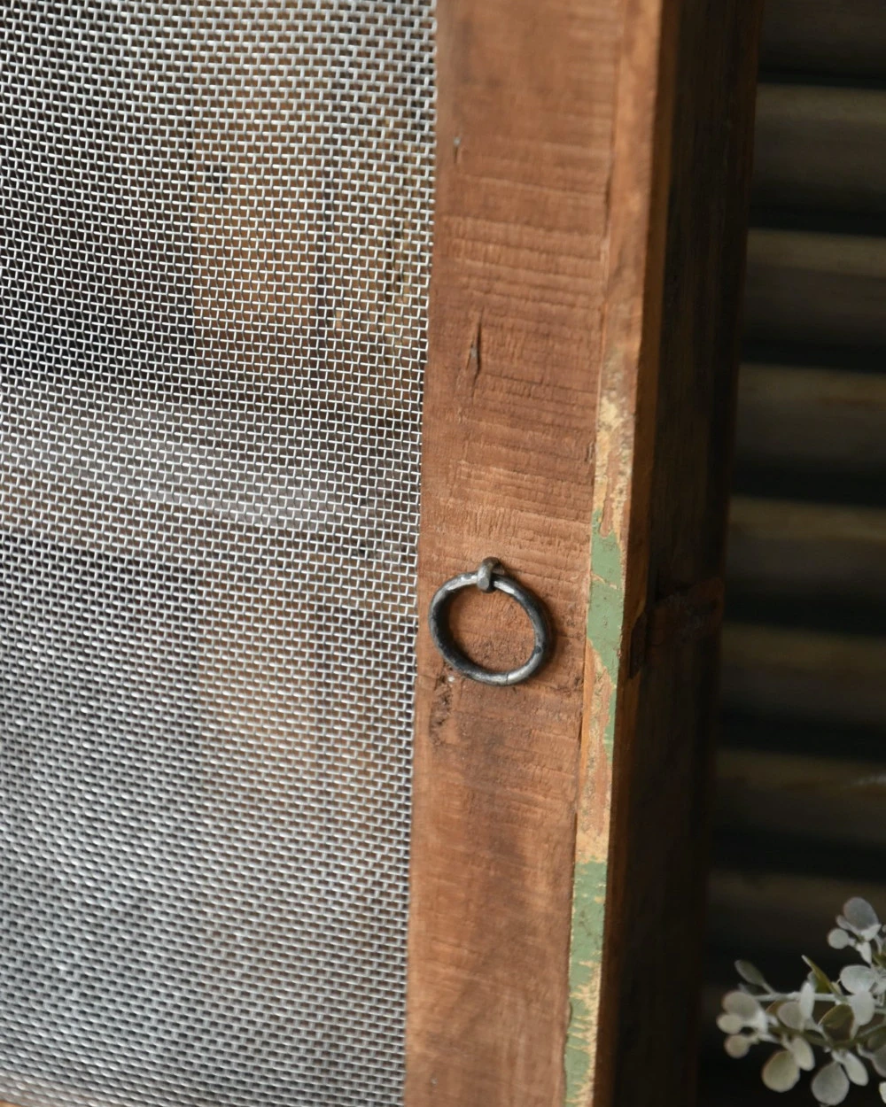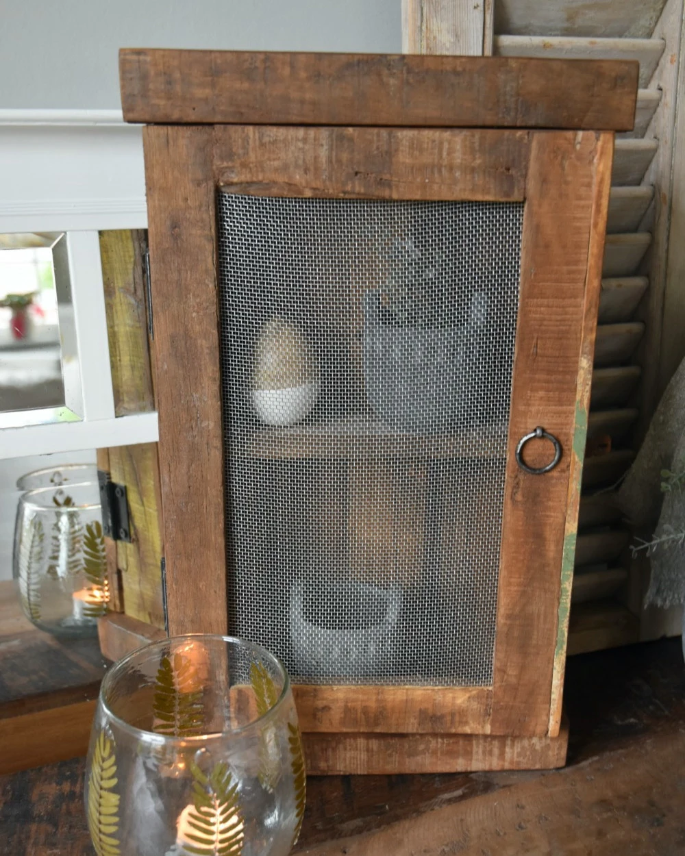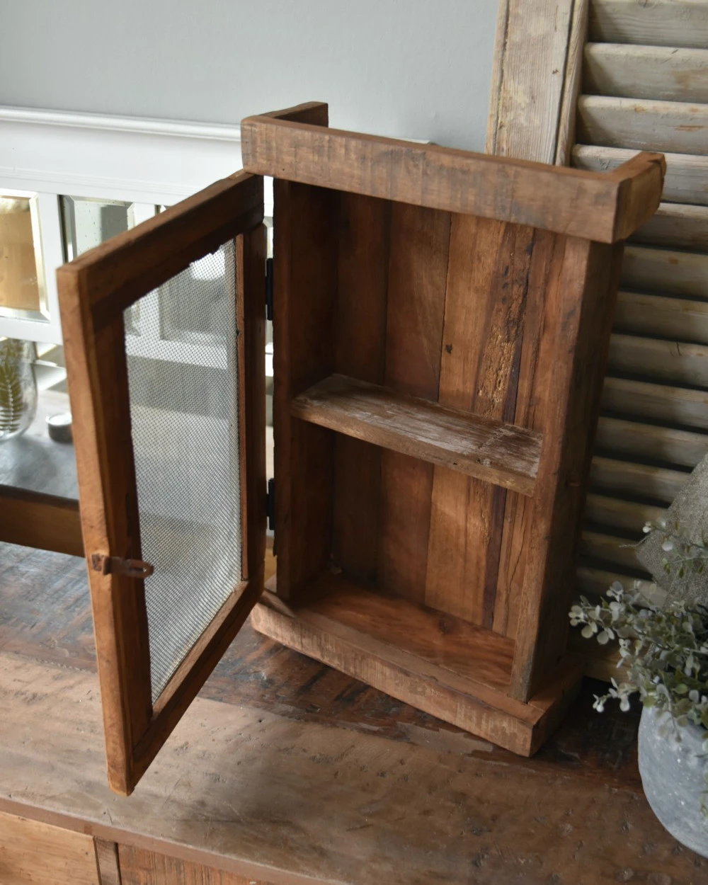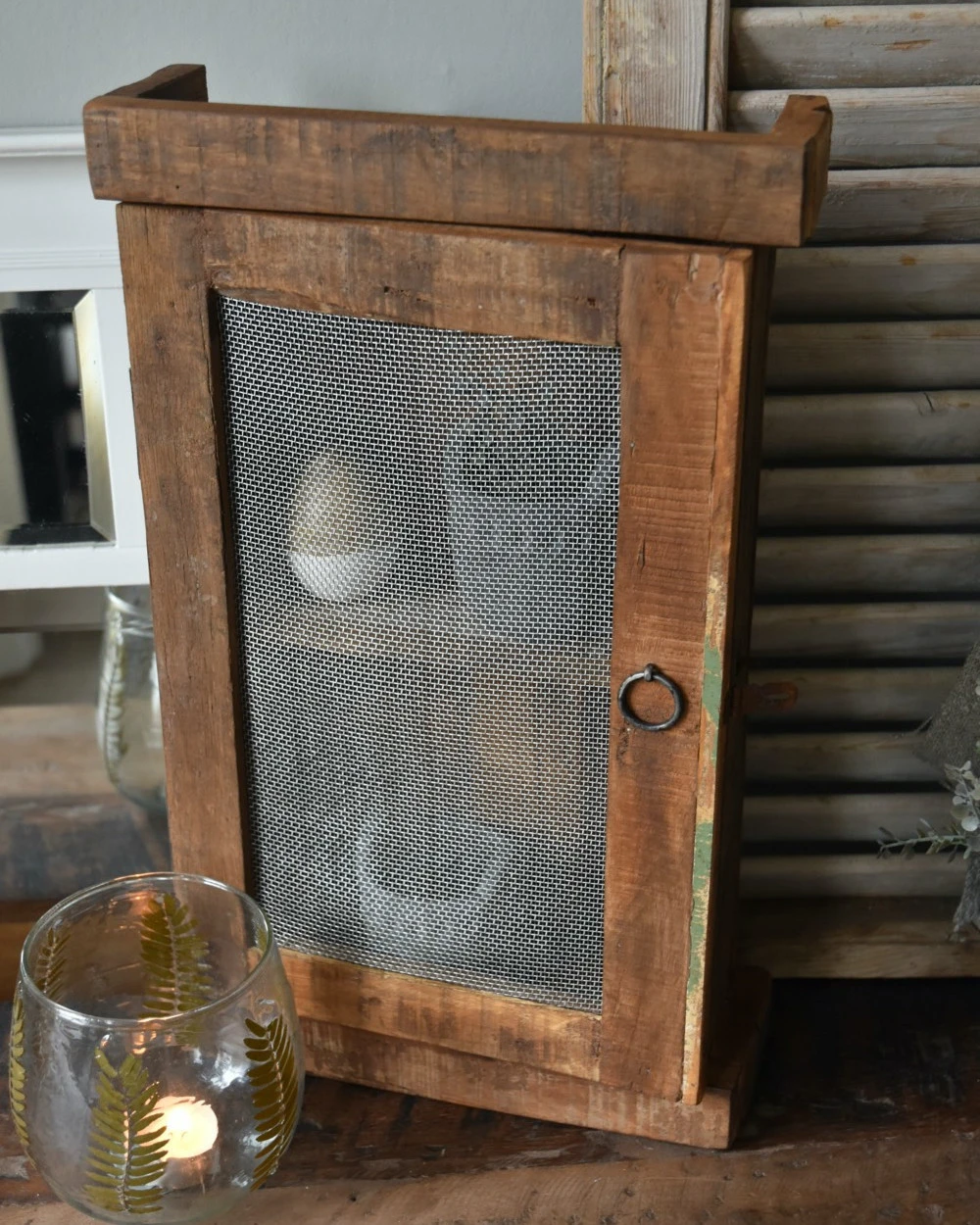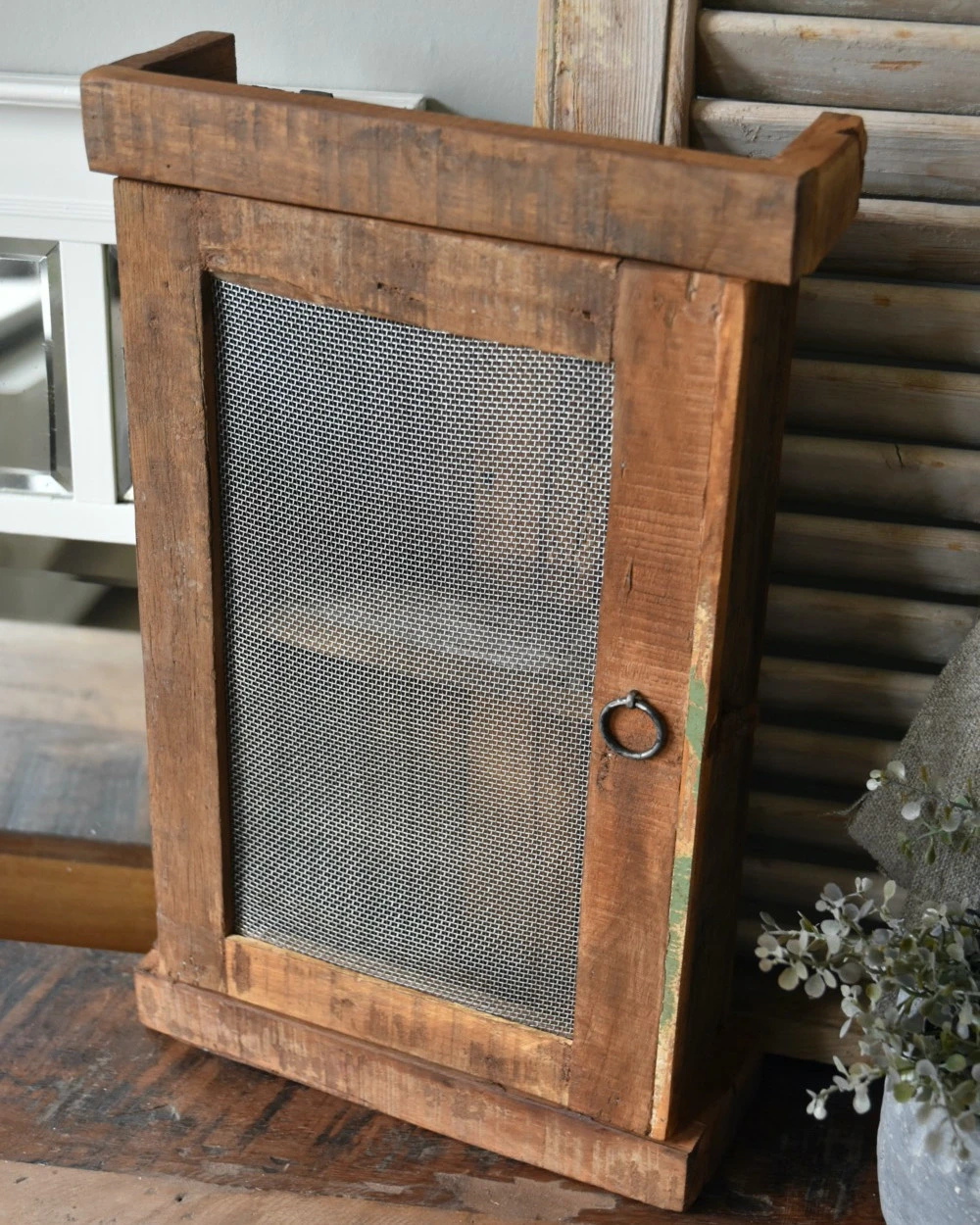 Oud houten ‘kaas’ kastje met gaas deur unique, IB Laursen. Dit mooie ‘kaas’ kastje van oud gerecycled hout heeft een deur met gaas erin en een opleg plank. Het kastje komt uit de Unique collectie van IB Laursen en is ook uniek doordat het hout gerecycled is en vol karakter. Ieder item heeft zo zijn eigen kenmerken. Het kastje is vrij zwaar, de deur met gaas heeft een oog als knop en naar de zijkant zit een slotje om hem dicht te houden. In de kast zit een legplank en aan de achterzijde zitten twee ophang ogen waarmee het kastje eventueel kan worden opgehangen. Ook is het hel geschikt om hem zo neer te zetten op de aanrecht of een niet al te hoge kast tegen de muur bijvoorbeeld.Â