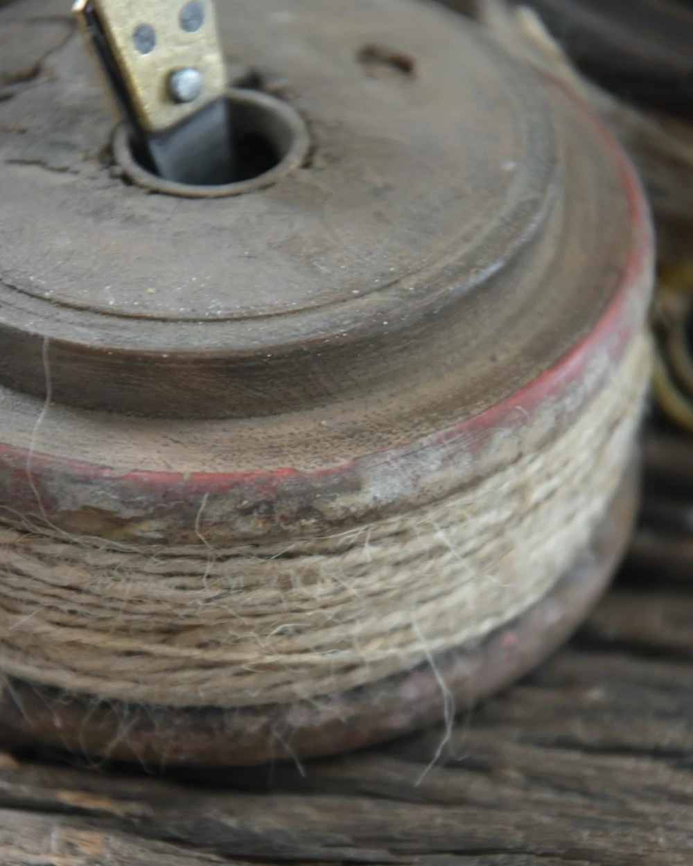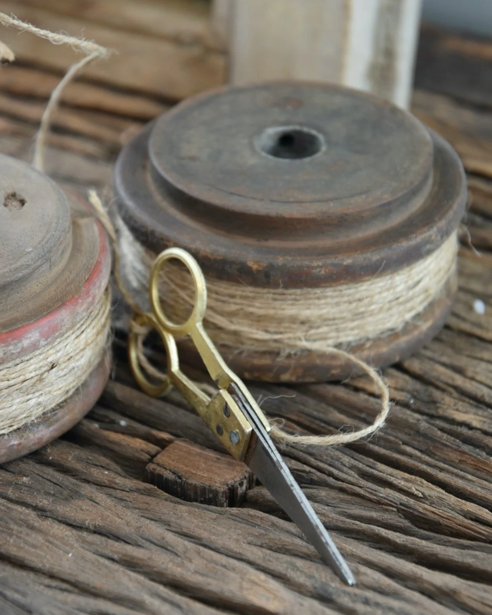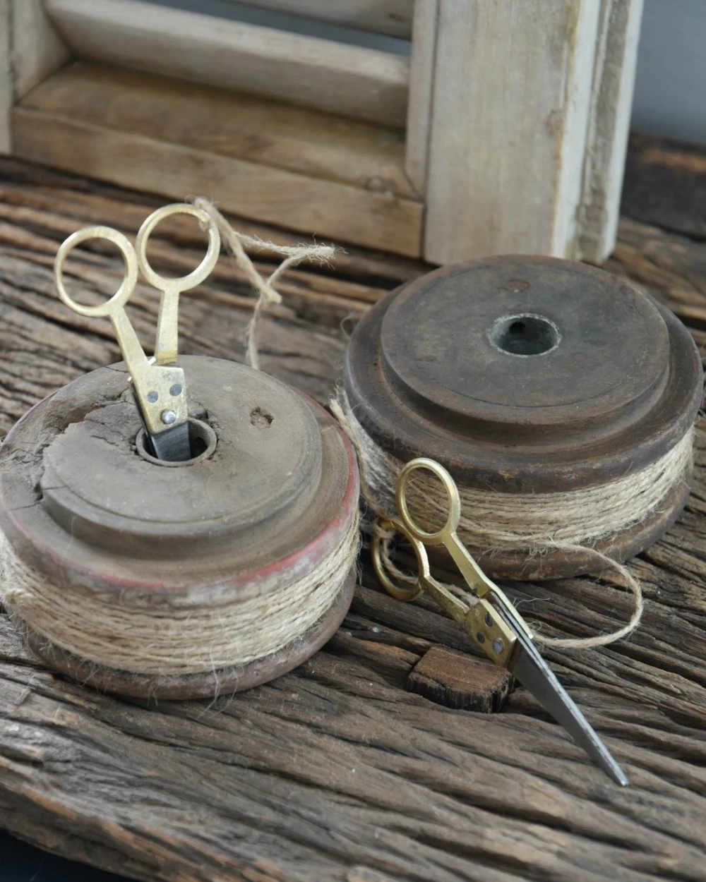 Oud houten spoel met touw en schaartje, IB Laursen per stuk. Deze leuke decoratieve spoel is omwonden met jute touw en heeft een klein schaartje die gemakkelijk in het midden te plaatsen is. Het hout van de spoel is oud en gebruikt wat een mooi karakter geeft aan de spoel, zo kunnen er stukjes uit het hout zijn en ook de tint en de maat van de spoel kan iets verschillen. Een mooie decoratieve aanwinst in de keuken bijvoorbeeld.