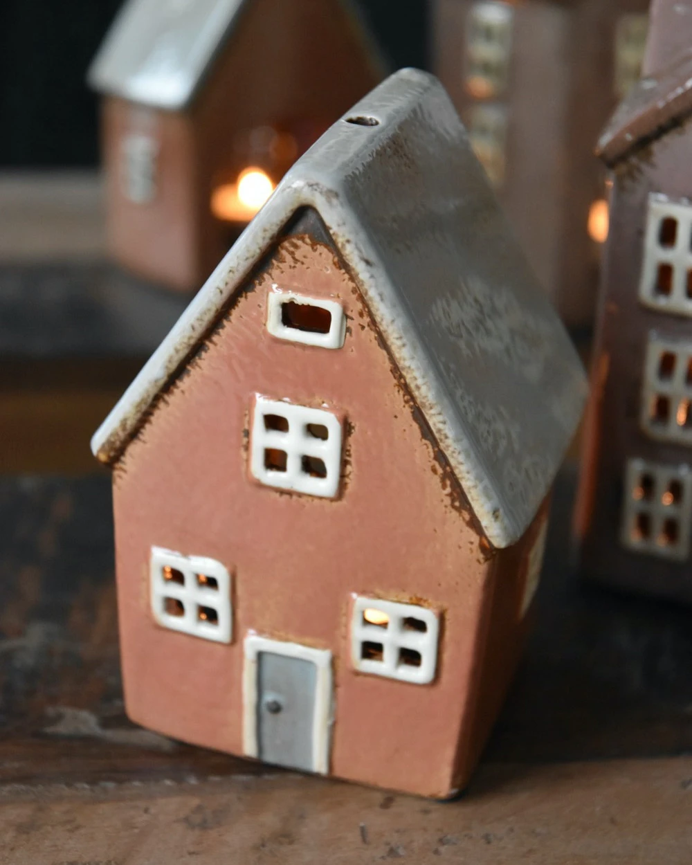 Pastel perzik kleurig theelicht huisje Nyhavn, IB Laursen. Dit leuke huisje van keramiek is in een mooie warme perzik kleurige pastel tint. Het huisje heeft open ramen zodat het licht er mooi door kan schijnen. De voordeur is zacht grijs en het punt dak heeft een klei witte tint. Aan de achterzijde zit een gat waar u een waxinelichtje in kunt zetten voor een mooi en gezellig schijnsel. U kunt de huisjes naar lust combineren en zo uw eigen dorp creëren. Het huisje is geïnspireerd op de Deense havenplaats Nyhavn die typeert met de gekleurde pakhuizen.