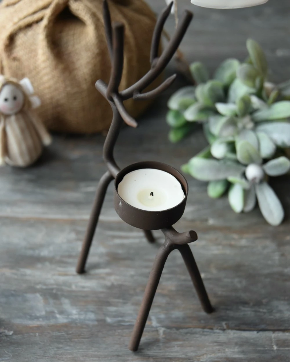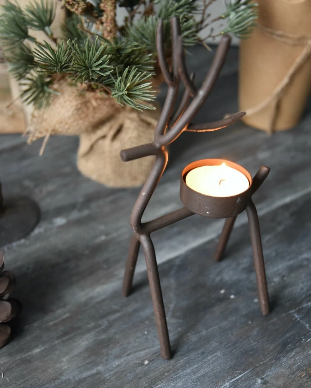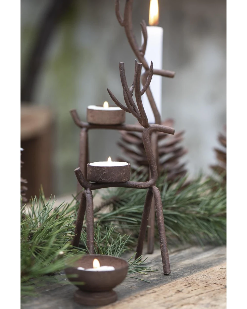 Rendier theelicht van metaal middel,, IB Laursen. Deze leuke waxinelicht houder is in model van een hert/rendier. De waxinelicht houder is gemaakt van een metalen frame in model van een hert/rendier met een waxinelicht inzet op de rug. Dit model is in twee maten verkrijgbaar en past goed bij de boom en kegel kandelaar, de Mistletoe en de ster kandelaar. Verder kan hij heel mooi worden gecombineerd met alle houten materialen en natuurlijke tinten bijvoorbeeld.