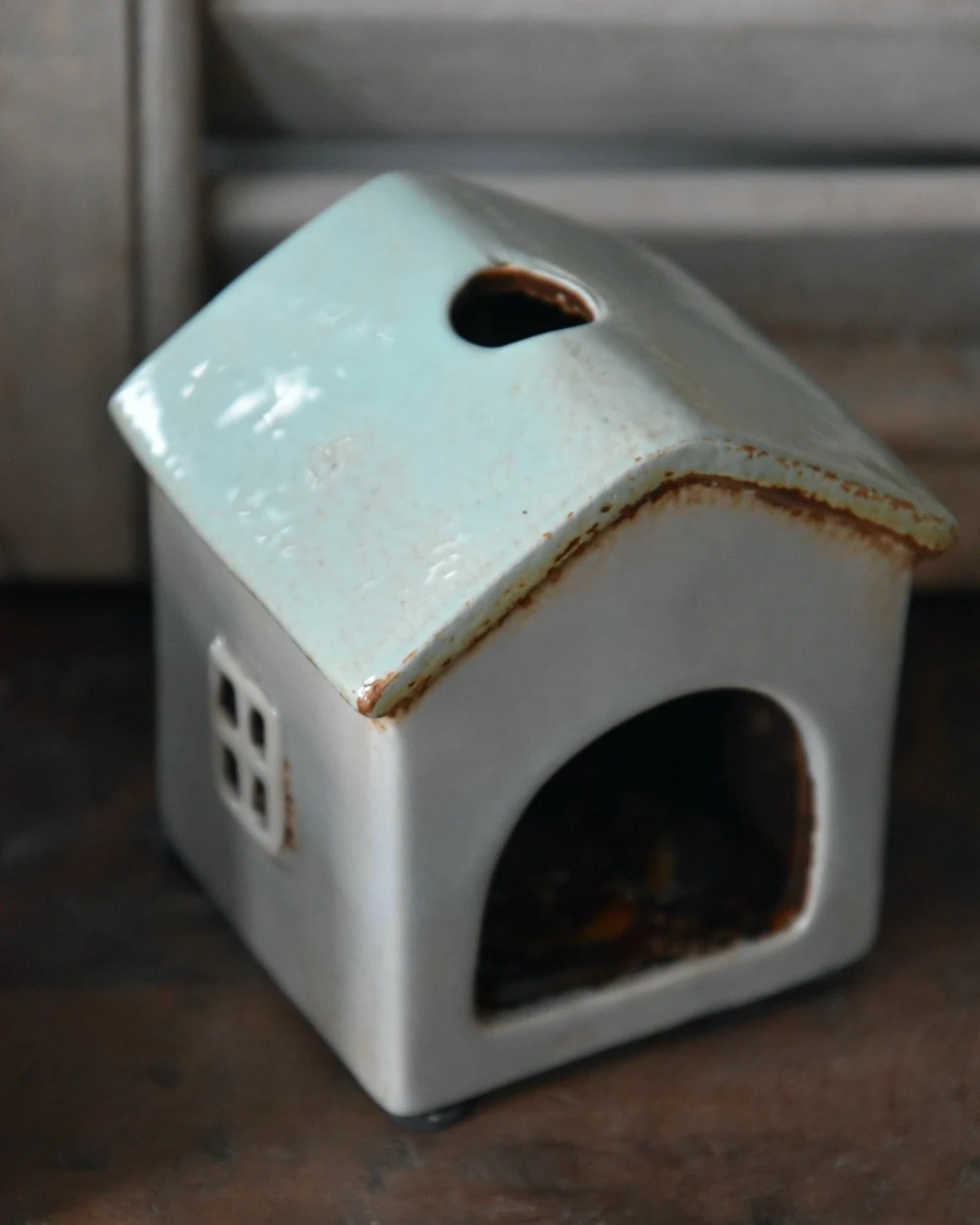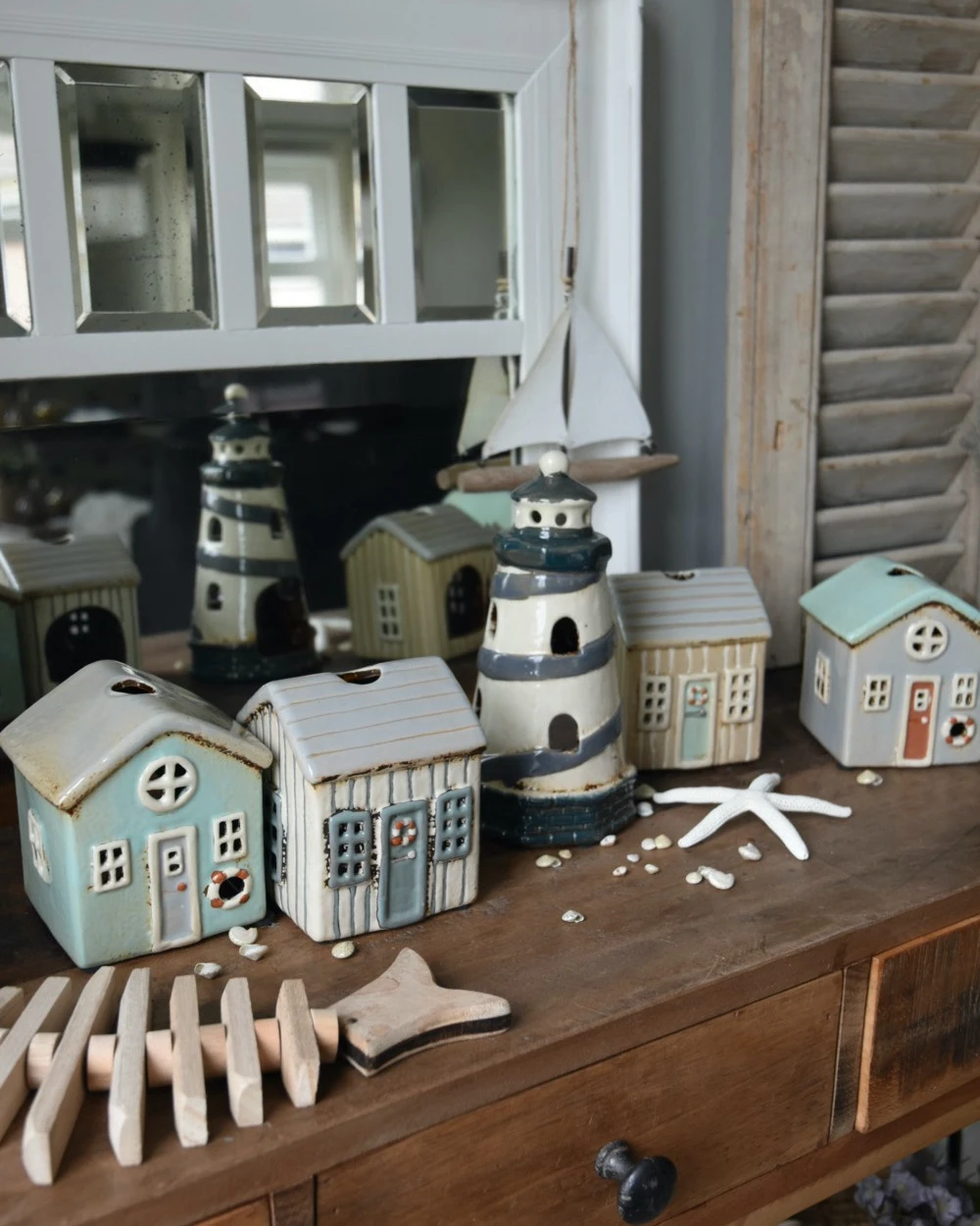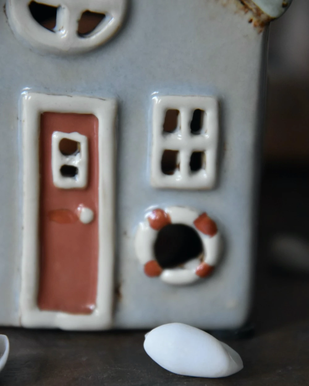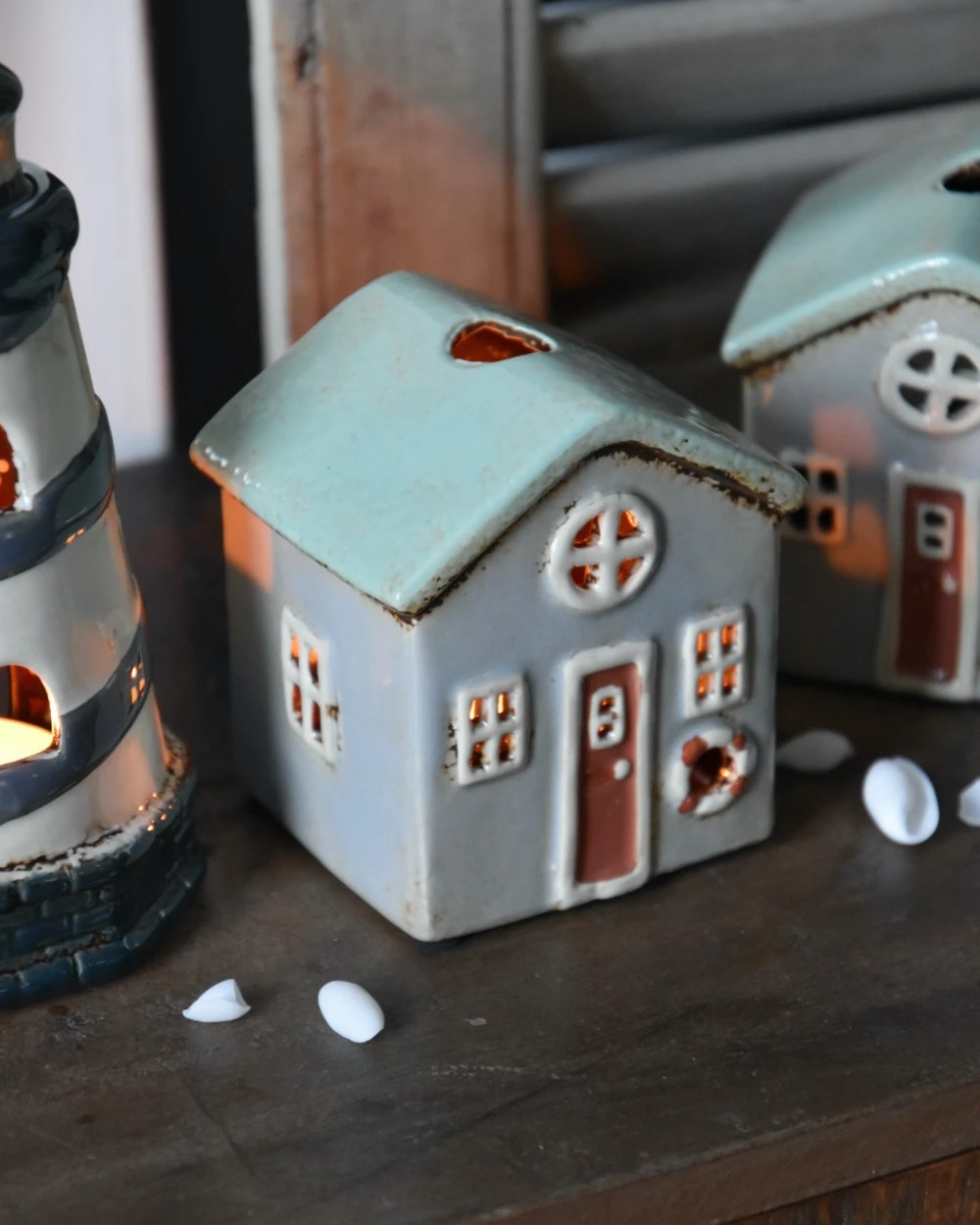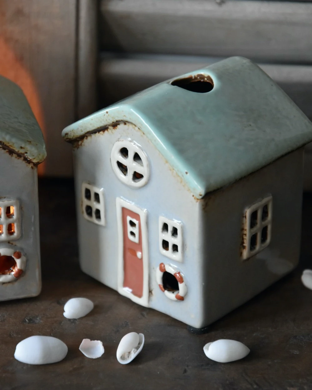 Strand theelicht huisje Løkken zacht grijs, IB Laursen. Dit leuke theelicht strand huisje van keramiek heeft een zacht grijze tint en een zacht zeegroen dak. Aan de voorzijde zit een patrijspoort als reddingsband ook is de deur in een roodachtige tint en de ramen zijn wit. Door alle ramen kan het schijnsel van het waxinelichtje schijnen. Het strandhuisje is geïnspireerd vanuit het Deense vissersplaatsje Løkken met zijn leuke strand met strandhuisje. U kunt ze ook erg leuk met elkaar combineren.