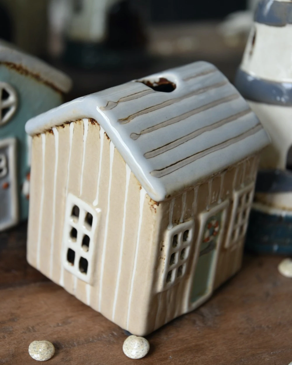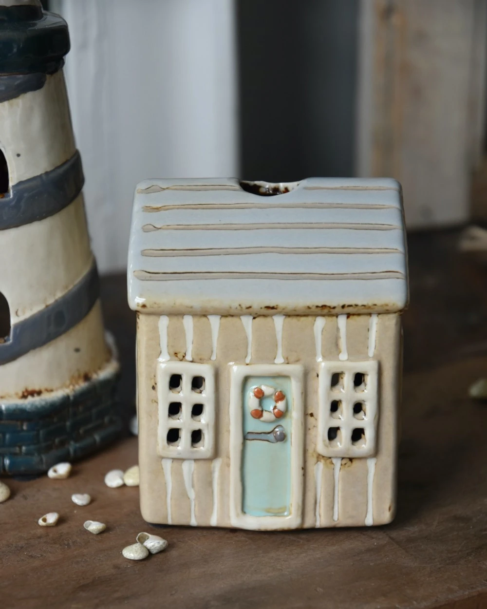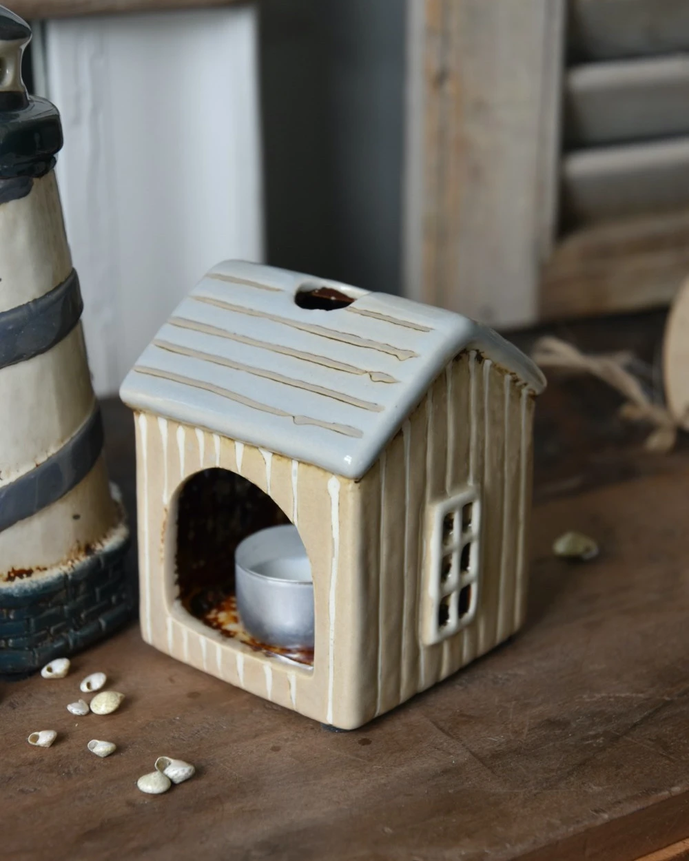 Theelicht strand huisje Løkken zand met plank effect, IB Laursen. Dit leuke keramiek theelicht strandhuisje heeft een zand tint met een verticaal planken effect die een gebroken witte tint heeft, wat doorloopt in de ramen en deur. Het dak is zacht grijs, de deur mint groen en er hangt een reddingsboei aan, ook alle ramen zijn open waar het schijnsel van het waxinelichtje door kan schijnen. In deze leuke strand serie zijn 4 verschillende huisjes en een vuurtoten verkrijgbaar (zolang de voorraad strekt) ook is het leuk om met schelpen, bootjes en andere maritiem items aan de slag te gaan om een mooi complete sfeer te krijgen…..