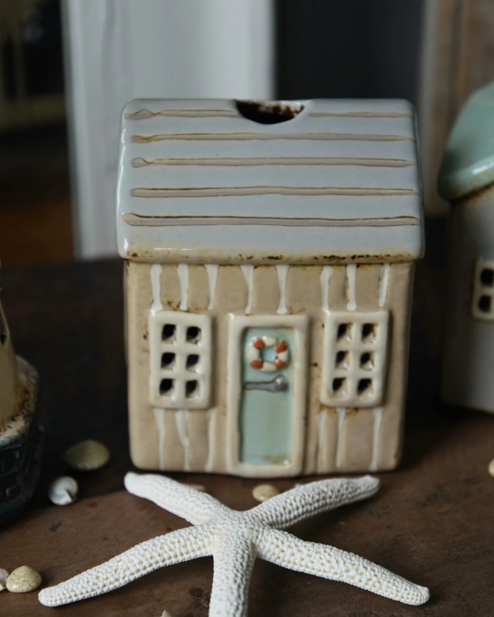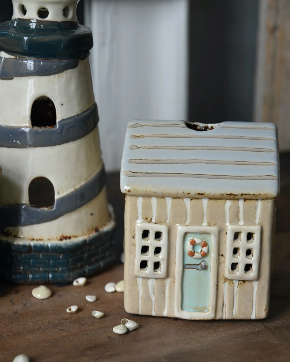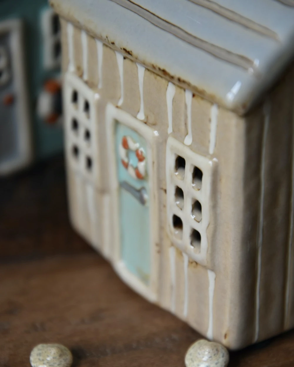Theelicht strand huisje Løkken zand met plank effect, IB Laursen. Dit leuke keramiek theelicht strandhuisje heeft een zand tint met een verticaal planken effect die een gebroken witte tint heeft, wat doorloopt in de ramen en deur. Het dak is zacht grijs, de deur mint groen en er hangt een reddingsboei aan, ook alle ramen zijn open waar het schijnsel van het waxinelichtje door kan schijnen. In deze leuke strand serie zijn 4 verschillende huisjes en een vuurtoten verkrijgbaar (zolang de voorraad strekt) ook is het leuk om met schelpen, bootjes en andere maritiem items aan de slag te gaan om een mooi complete sfeer te krijgen…..